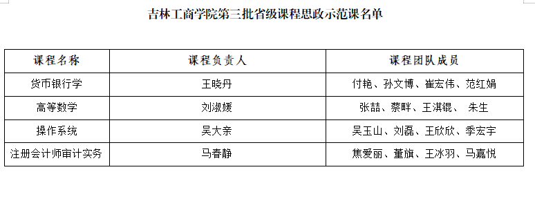 近日,吉林省教育厅公布了《关于公布吉林省本科高校第三批省级课程思政示范课程名单的通知》,我校《货币银行学》《高等数学》《操作系统》《注册会计师审计实务》4门课程成功入选,在课程思政建设领域再添新成果。