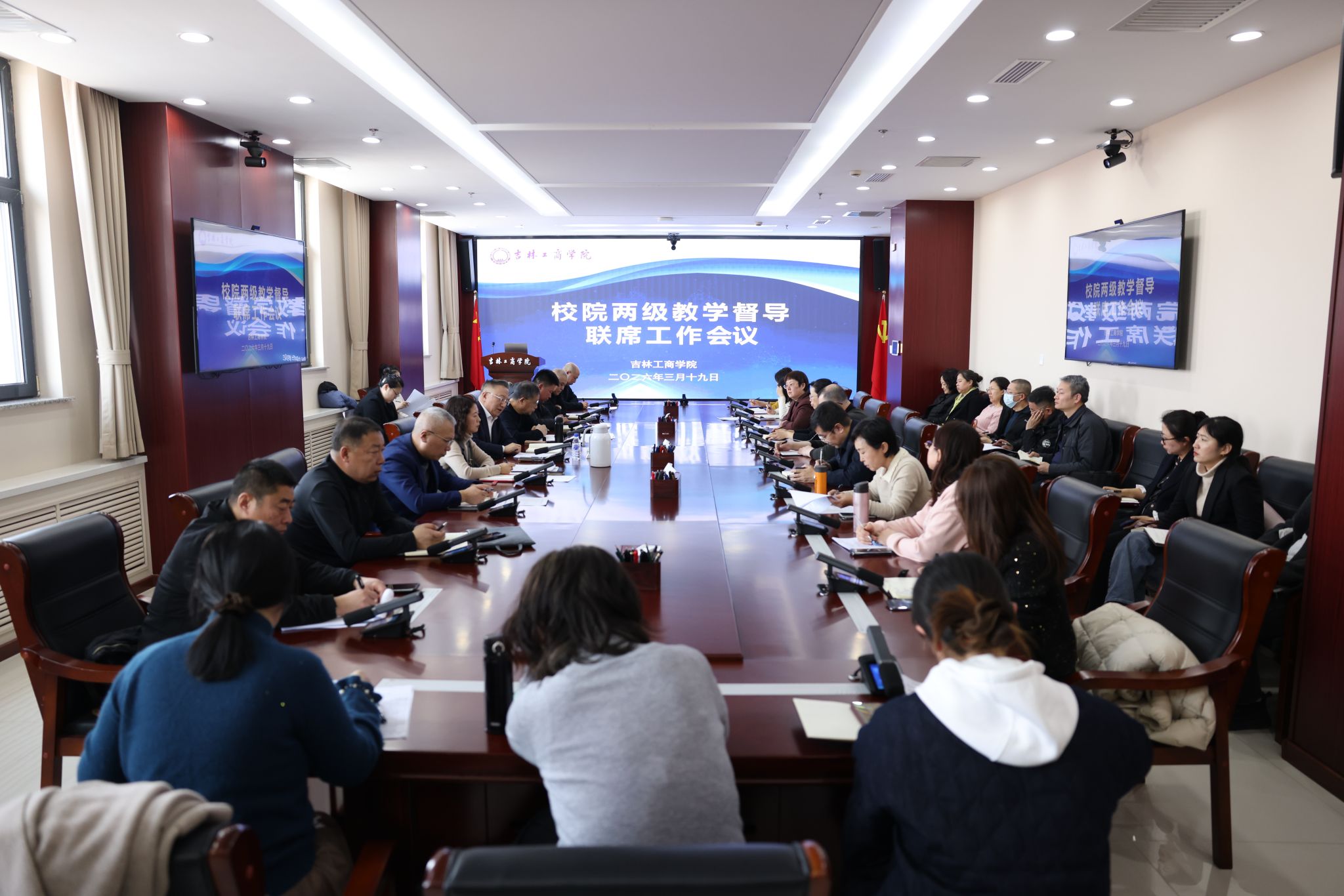 校级教学督导员、二级教学督导组组长、教务处、学生工作处、创新创业学院等部门相关负责人,教学质量监控与评价中心全体工作人员参加会议。