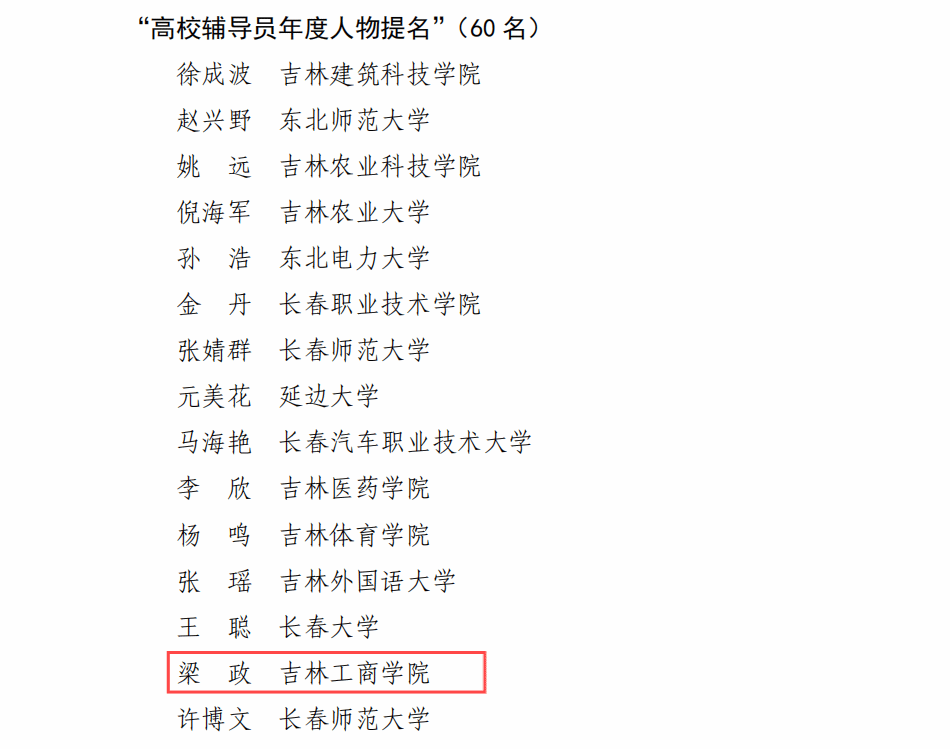 近日,吉林省教育厅公布了2024年吉林省“高校辅导员年度人物”推选展示活动评选结果,经学校推荐、专家评审,评选出吉林省“高校辅导员年度人物”10人、“高校辅导员年度人物提名”60人。我校工学院辅导员梁政、粮食学院辅导员朱诗萌荣获2024年吉林省“高校辅导员年度人物提名”。